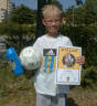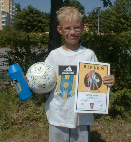 Joakim får diplom för väl genomförd fotbollsskola.