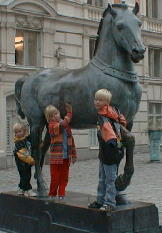 John, LInn och Seth framför en brons häst.