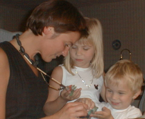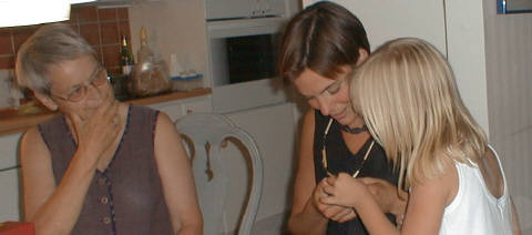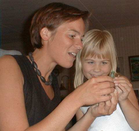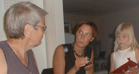 Mer saker undersöks av Linn och Charlotta. Inger i bakgrunden tittar på barn och barnbarn.